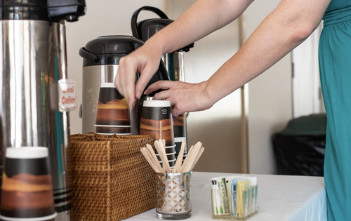 Each week we offer caffeinated and decaffeinated Coffee, hot water for tea and cocoa, as well as sugar, sugar substitutes, and creamer in our main lobby.